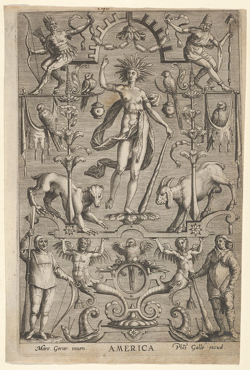 This Allegory of America is part of a series of engravings of the four continents after drawings by Gheeraerts. European artists from the Renaissance onwards represented the known world through allegorical figures derived from antiquity. They often took the form of clothed or naked women and were used in ephemeral works made for triumphal entries and pageants, in maps, coins, prints, and the decorative arts. The representations were eventually standardized in the Iconologia by the Italian Cesare Ripa (1593; illustrated in 1603), and supplemented by contemporary travel accounts. In his representations of the Continents, Gheeraerts surrounded the allegories -- sexualized young women -- with the symbols and attributes that the artists and the viewers associated with each continent—in some cases the commodities to be traded and resources to be exploited. These images, steeped in a white Christian and male Eurocentrism, reinforced ideas of the self and the other that characterized the era.