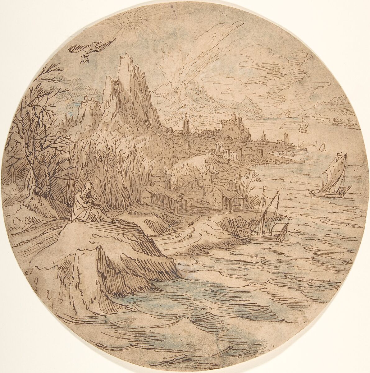 The narrative occupies only a small part of the composition, for the circular drawing is dominated mainly by the outstretched coastal landscape. This is typical feature of the art of the time, as landscape was increasingly given greater prominence relative to biblical or historical narratives, and would eventually develop into an independent genre. The bird’s eye perspective with its high horizon equally was a common compositional structure in sixteenth-century Netherlandish landscape art, and caused them to be referred to as ‘world landscapes’ in art historical literature.