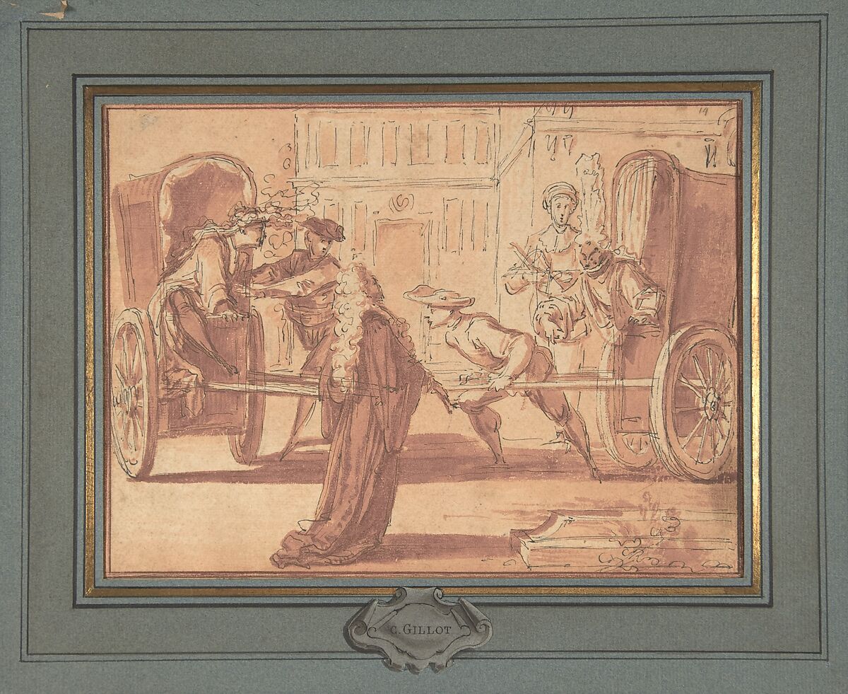 The irreverence of the commedia dell'arte provided many of Gillot's most memorable subjects. This drawing relates to his best-known painting, Les deux carrosses (Musée du Louvre, Paris). It was directly inspired by a short sketch appended to a three-act comedy, Foire Saint Germain, which was first performed in 1695. An altercation breaks out between two cabmen and their passengers (commedia dell'arte characters Arlequin and Scaramouche, both dressed in women's clothing) when the carriages meet in a narrow alley and each refuses to back up and let the other pass. The sketch concludes when a passing judge attempts to mediate the conflict but instead becomes the focus of the collective ire and is chased offstage.
