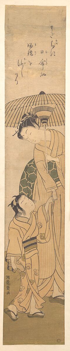 Koryūsai's light-hearted pair are accompanied by the lines of a poem above the umbrella that read both visually and verbally as the colors and capricious sunshine of spring weather: