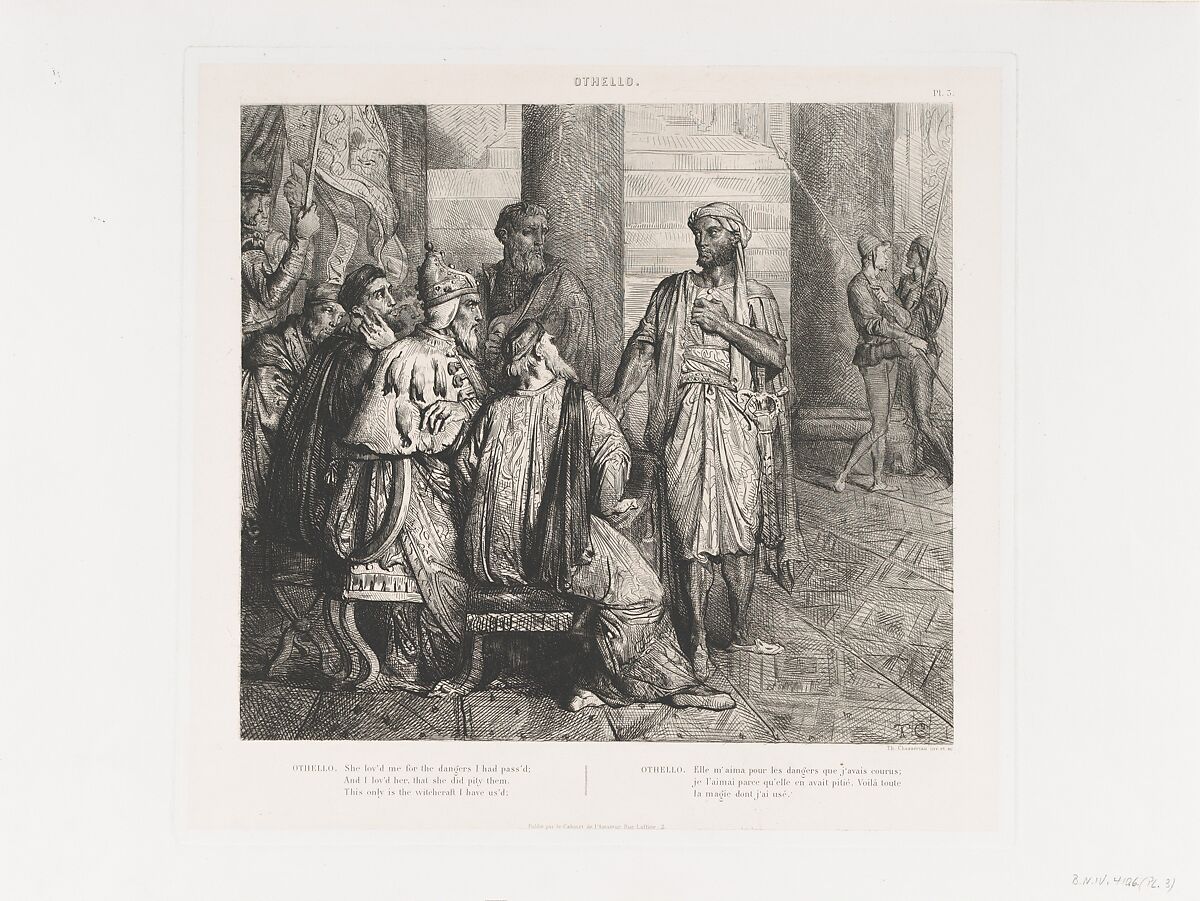 In 1844 Eugène Piot commissioned the young Chassériau to prepare fifteen illustrations to Shakespeare's Othello. Inspired by a series of ground-breaking Hamlet lithographs that Delacroix had created one year earlier, the younger artist opted for the more linear technique of etching. His expressive conception of form had been learned in Ingres's studio then developed under Delacroix. In the series, key exchanges offer a compressed summary of much of the play, with a final cluster devoted to the tragic conclusion. Here, Othello explains to the suspicious Duke of Venice and other dignitaries how he won Desdemona's hand in marriage.