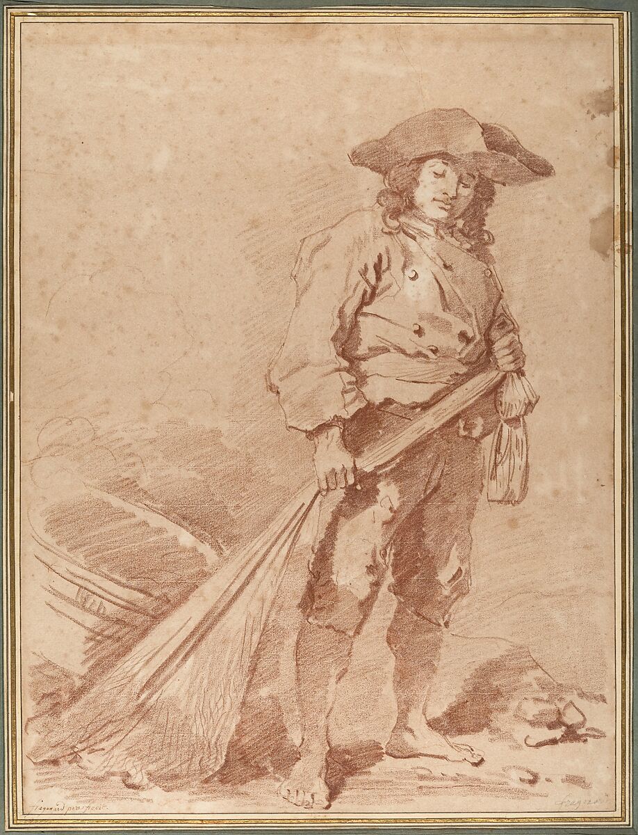 Drawn on an unusually large scale, this pair of studies (see also 2006.353.2) embodies the accomplishment and confidence of Fragonard’s mature manner. Red chalk is used not only to delineate form, but to lay in areas of light and shadow through broad hatching and modulation of pressure. Despite their bare feet and somewhat ragged attire, the fishermen cut dashing figures with their broad-brimmed hats, billowy jackets, and looped-over sashes. The low angle of the sunlight and the slight weariness of their poses are both suggestive of end of the day labor.