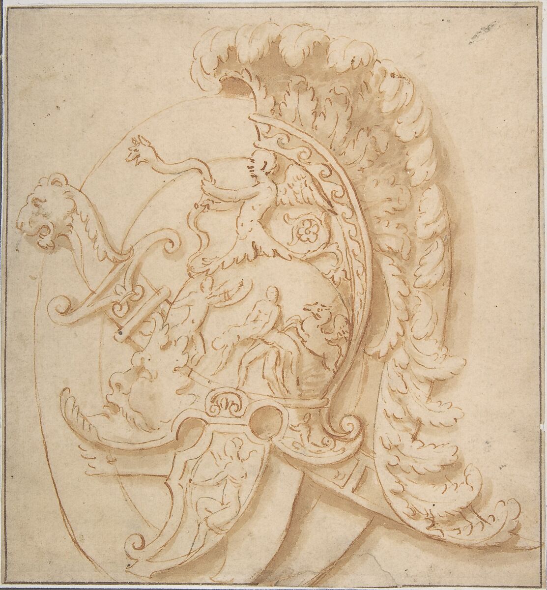 Design for a Trophy with Sword and a Plumed Helmet Decorated with Grotesques Masks, Classical Motifs