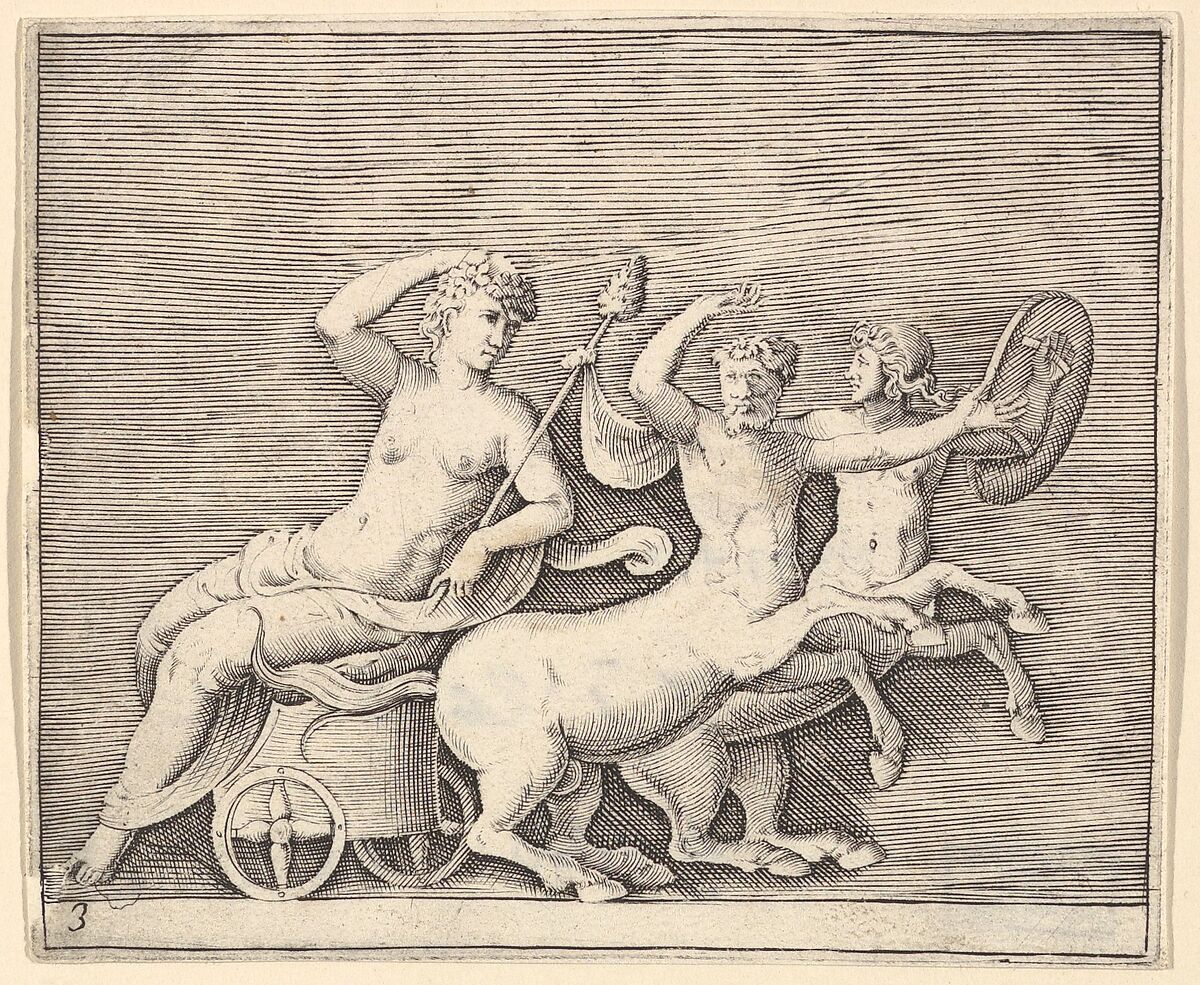 - Title: Reclining Female Figure on a Chariot drawn by Two Centaurs, from "Ex Antiquis Cameorum et Gemmae Delineata/ Liber Secundus/et ab Enea Vico Parmen Incis"