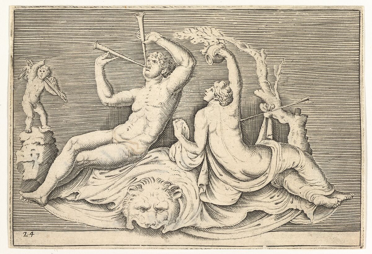 - Title: Man Playing Two Flutes and Woman on Lionskin, from "Ex Antiquis Cameorum et Gemmae Delineata/ Liber Secundus/et ab Enea Vico Parmen Incis"