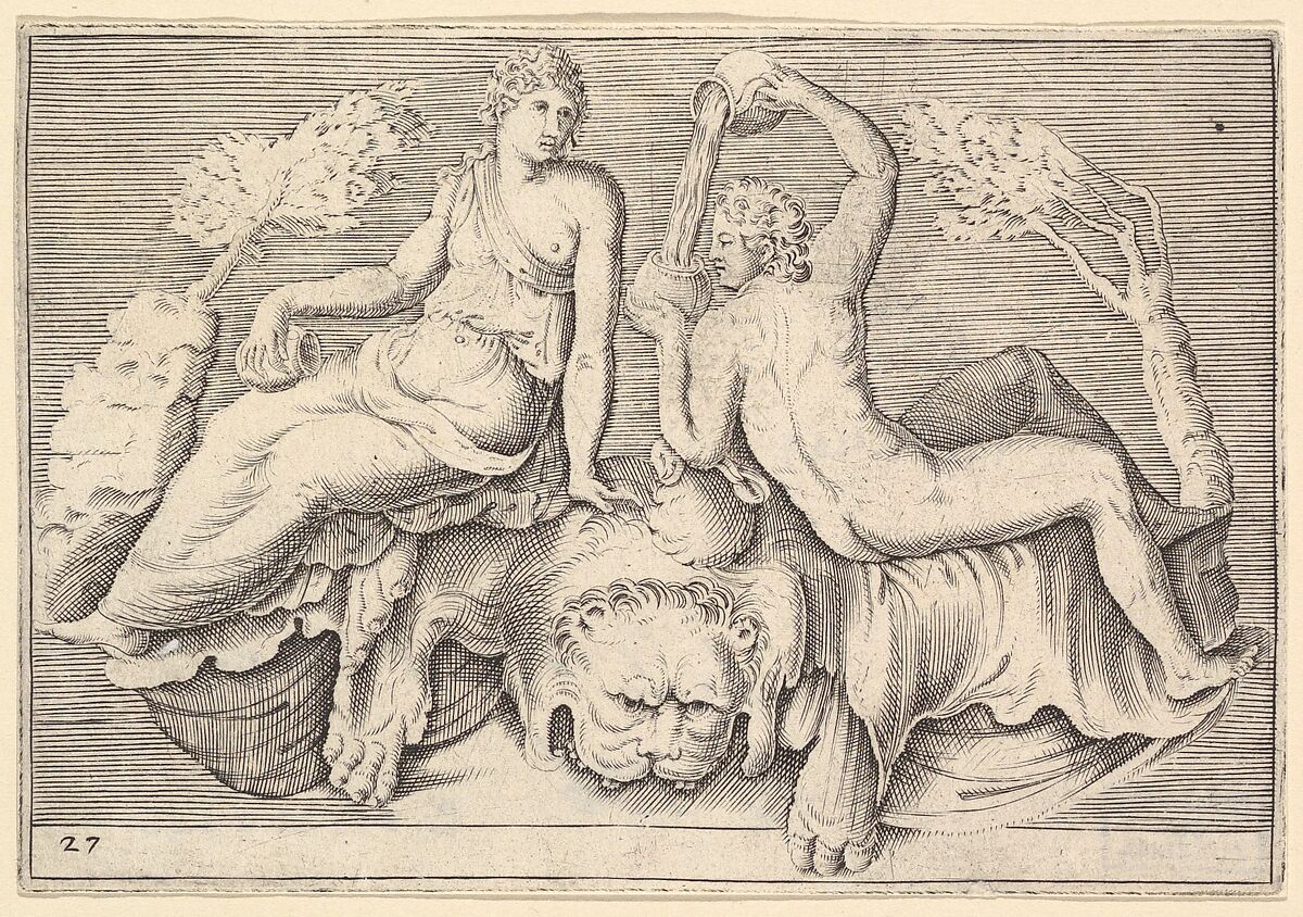 - Title:Woman and Man Seated on Lionskin, Man Pouring Wine, from "Ex Antiquis Cameorum et Gemmae Delineata/ Liber Secundus/et ab Enea Vico Parmen Incis"