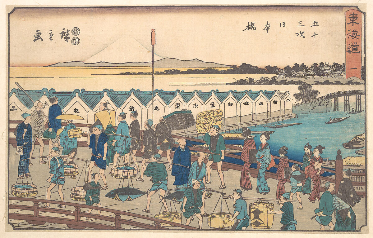 The journey depicted in the Fifty-three Stations of the Tōkaidō begins with Nihonbashi, the "Bridge of Japan" that marks the center of the city of Edo. Hiroshige illustrates the hustle-bustle of the traffic on the bridge. Large fish are delivered from the nearby fish market. Behind the bridge warehouses are lined up along the river. Some of the Japanese characters on the white walls of the buildings correspond to the name of the publisher of this Tōkaidō series, Maruya Seijirō. This print shows the bridge across the composition and includes a panoramic scene of Edo castle and Mount Fuji. By contrast, the Hoeidō print shows a procession approaching the end of the bridge that is viewed frontally at the center of the composition.
