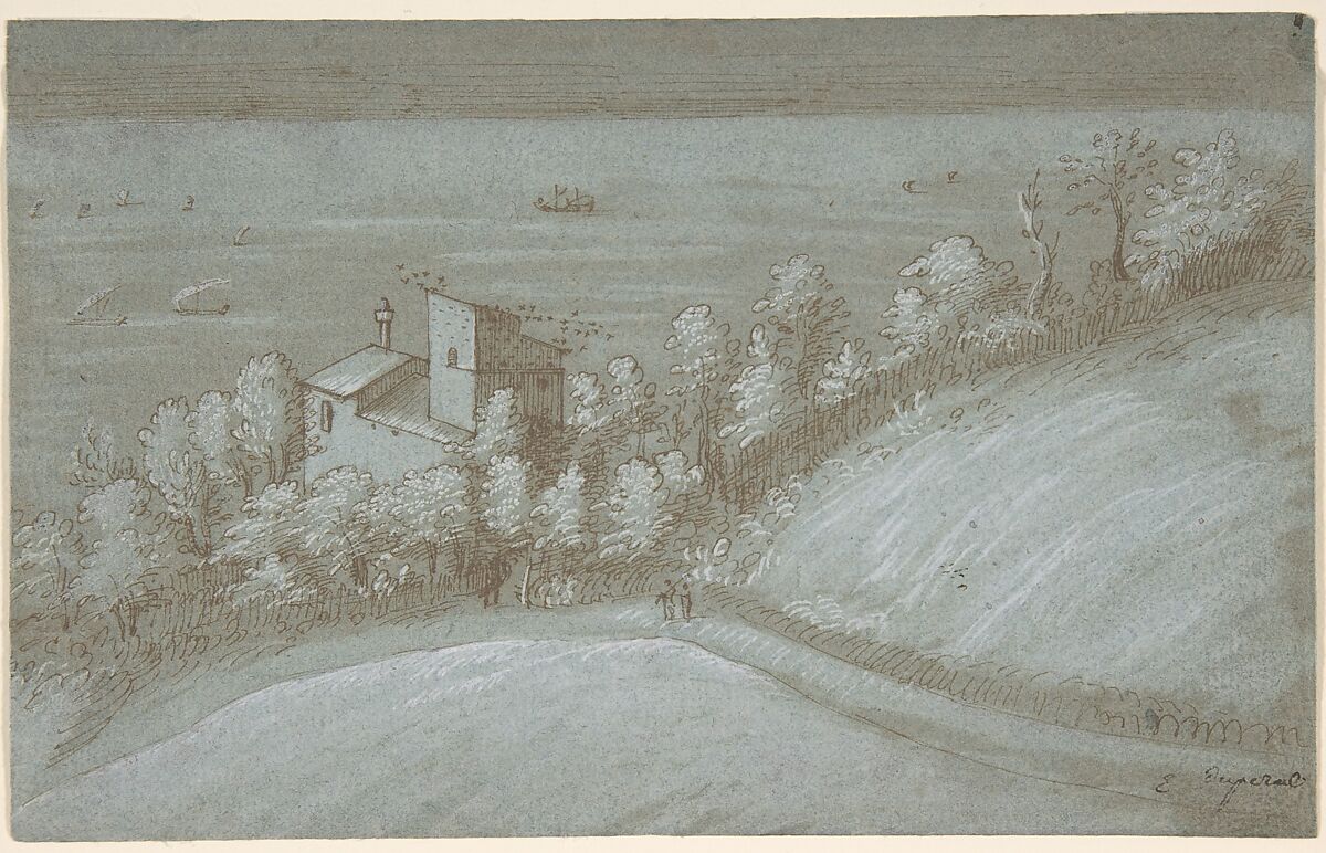 Carefully studied from nature, this landscape study in a roving perspective or bird's-eye view portrays a house with a dovecote and trees by the calm sea with dotted with little boats. The composition is erroneously annotated in pen and dark brown ink at lower right: "E. Duperac." The verso is annotated at upper left in pen and brown ink script: "crozat."