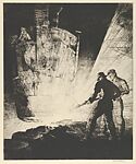 Allen engaged the contemporary subject of industrial labor using the traditional printmaking technique of etching. Etching can facilitate a powerful chiaroscuro effect through extreme contrasts of light and shadow, which allowed Allen to imbue his prints of construction workers with a sense of theatricality and heroism.