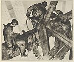 Allen engaged the contemporary subject of industrial labor using the traditional printmaking technique of etching. Etching can facilitate a powerful chiaroscuro effect through extreme contrasts of light and shadow, which allowed Allen to imbue his prints of construction workers with a sense of theatricality and heroism.