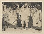 Bacon took a portraiture class at the Art Students League of New York taught by Bellows. Here, she used drypoint, an intaglio printing technique she had taught herself using zinc plates and an old printing press discovered in a League classroom, to depict her teacher surrounded by students. While Bellows taught traditional portraiture methods, Bacon preferred a caricature style; she once acknowledged that each figure here is a portrait of a particular individual.
