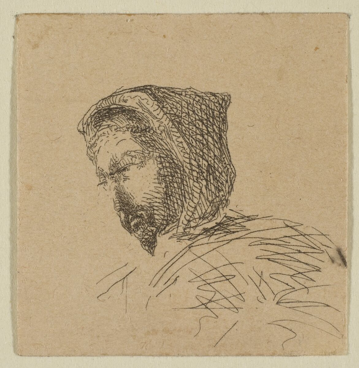 Whistler made his first etchings while employed as a draftsman at the U.S. Coast and Geodetic Survey in Washington, D.C., between 1854 and 1855. A staff member taught him the technique and supplied him with a copper plate, on which he etched topographic renderings of coastlines, then sketched freely drawing figures. This fragment represents a Spanish hidalgo, or minor nobleman, and likely was intended as a self-portrait. It was trimmed from a printed proof and given to given to Thomas Winans, a friend in Baltimore who financed Whistler's move to Paris in 1855, allowing him to pursue an artistic career. Winans mounted the fragment in an album of Whistler's early work that his descendants gave to the Museum.
