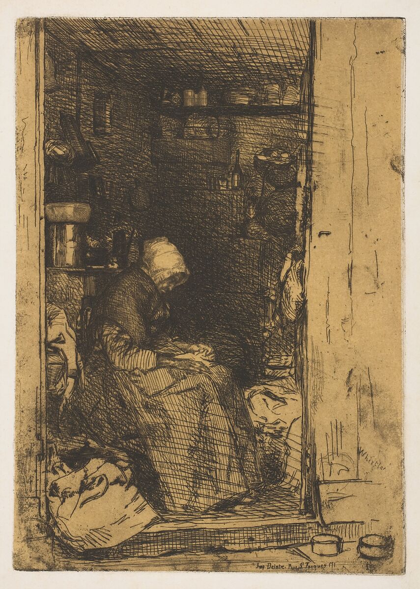 After visiting the Rhineland during a summer–fall tour in 1858, Whistler created this image of an elderly woman sorting rags (loques). He here develops a formula to which he would often return—using an open entrance to frame a receding interior that contains figures and objects. Like "La Mère Gérard" and "La Rétameuse," the artist focuses on an old working woman, dignified but without sentiment. Created late in 1858 this is one of the most complex prints in "Douze eaux-fortes d’après nature" (Twelve Etchings from Nature), the artist's first published set. This impression belonged to Thomas Winans, a Baltimore friend who financed the artist's move to Paris in 1855; Winans kept the print in an album that descendants gave to the Museum.