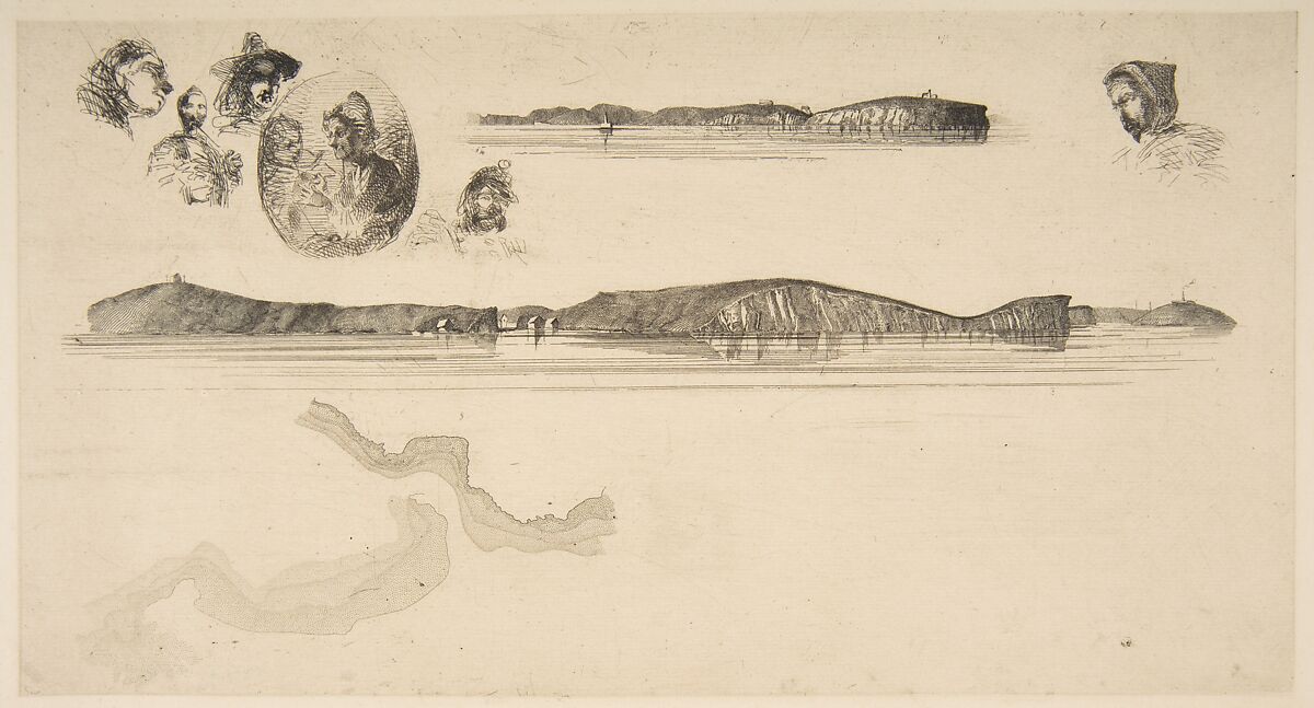 Whistler made his first etching while employed as a draftsman at the U.S. Coast and Geodetic Survey in Washington, D.C., between 1854 and 1855. A staff member taught him the technique and supplied him with a copper plate, on which he etched topographic renderings of coastlines, then sketched freely drawn figures, and an oval vignette representing "Mrs. Partington and Ike"—characters from a Mark Twain story. The hooded hidalgo, or minor Spanish nobleman, at upper right is likely a self-portrait that hints at the artist’s bubbling ambition. Within a few months, he would be in Paris, pursing an artistic career.