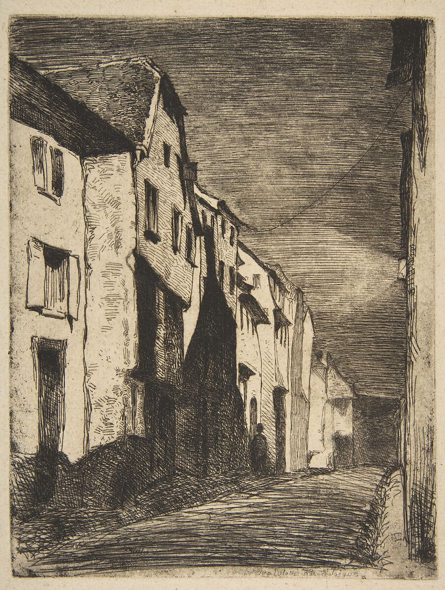 After visiting the Alsatian town of Saverne in the summer of 1858, Whistler produced his first etched "Nocturne." Sharp recession heightens the irregular forms of old buildings, with a gas lantern hanging at right casting deep shadows. The choice of paper and "artistic" inking, carried out by the leading Parisian printer Auguste Delâtre, enhance the effect. Whistler included this work in his first published set, "Douze eaux-fortes d’après nature" (Twelve Etchings from Nature), which he always referred to as the "French Set."