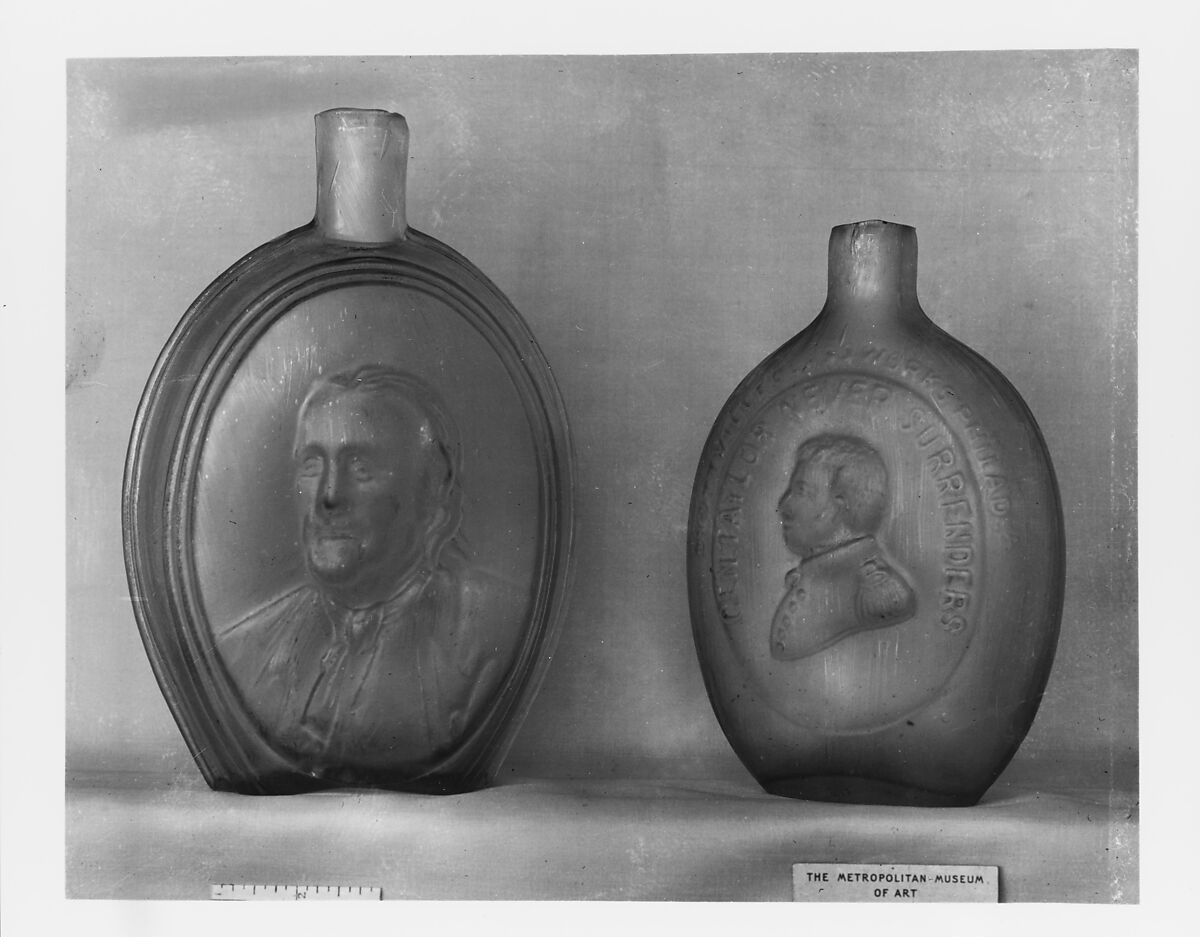 On the obverse is a classical profile bust of George Washington; on the reverse, General Zachary Taylor. The inscription on the reverse refers to Taylor's exploits in the Mexican War, 1846–1848, which made him into a popular national hero. The production of this flask probably coincided with Taylor's successful presidential campaign of 1848. The maker's mark on this and similar flasks serves as the basis of attribution for a number of variant Washington-Taylor flasks, such as 10.109.19, which are unmarked. This flask was blown in a two-part full size "contact" mold.