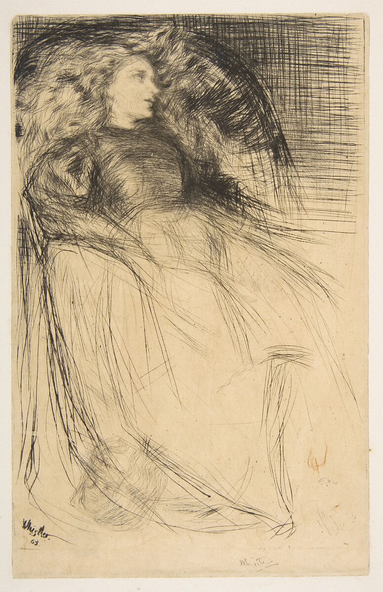 Whistler's confidence as an etcher is seen in this portrait of Jo Hiffernan, his model, muse and companion in the 1860s. The artist's brother-in-law Seymour Haden taught him to etch and showed in works by Rembrandt. From the latter, Whistler learned to approach printmaking as an experimental process in which portions of an image could be left suggestively undeveloped. Here, Whistler used drypoint, scratching lines into the copper to throw up a burr that caught the ink and printed in a soft, evocative manner. A shadowy female head visible at lower right demonstrates that the artist changed his mind as he worked, turned the plate around, and began the design afresh. Jo's pose and sensuously unbound hair echo languid images of women beautiful women created by the Pre-Raphaelite painter Dante Gabriel Rossetti who lived near Whistler in Chelsea.