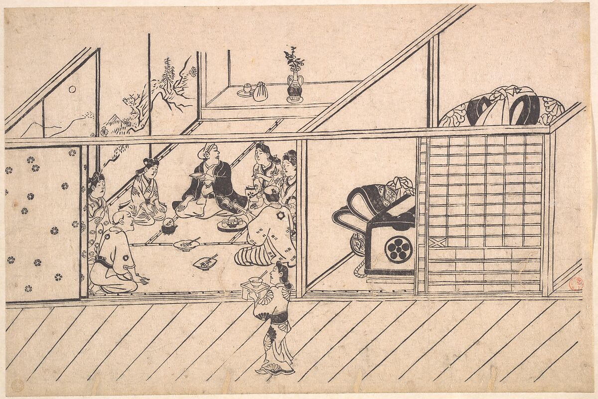 This party at a teahouse is at its height. The guest room is embellished with painted sliding panels and a flower arrangement. A pile of bedding is seen in the adjacent room.