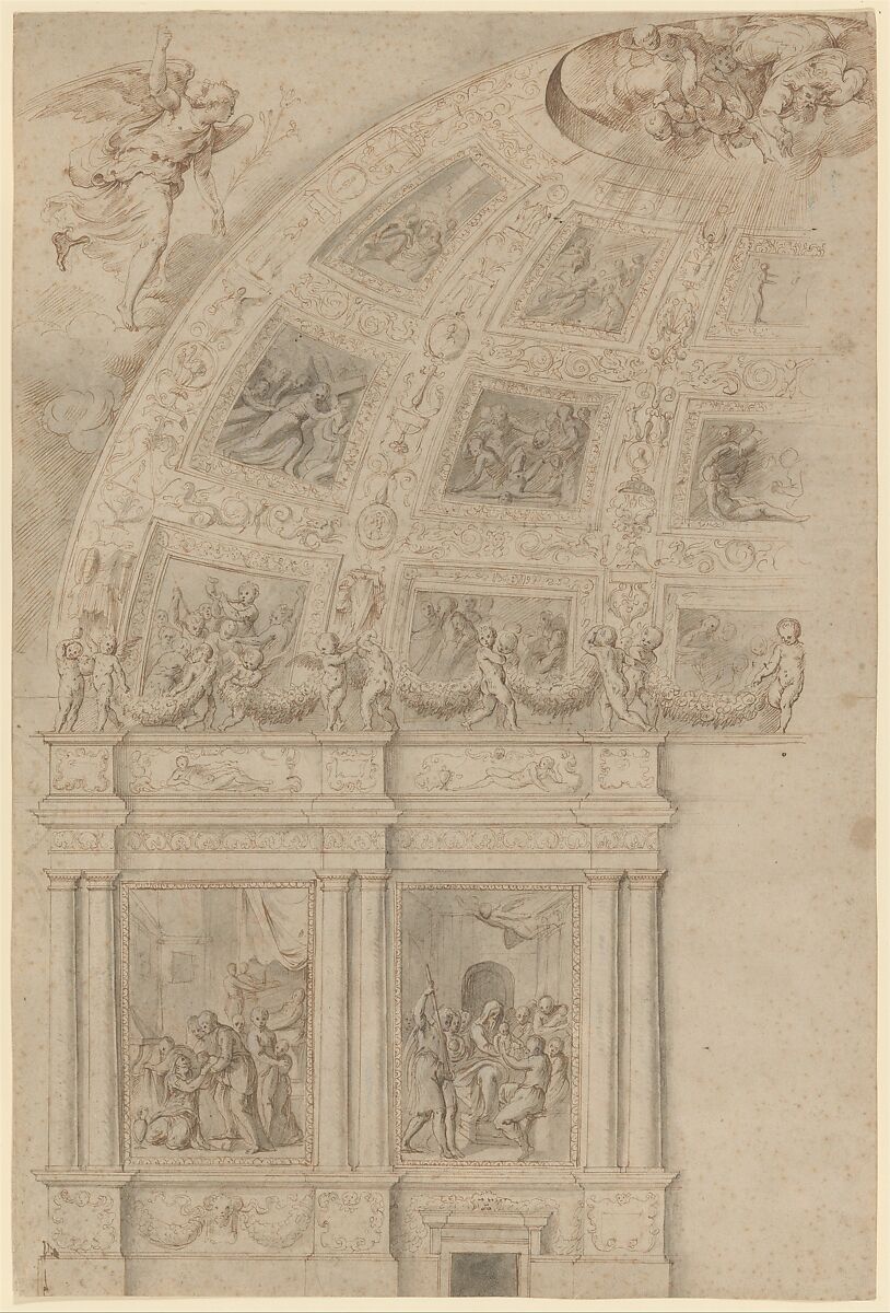 This drawing is thought to have been intended for the decoration of the apse of the Cathedral of Urbino (destroyed in the 1789 earthquake), a project that was either lost with the collapse of the building or not executed. Probably born in Venice, Battista Franco was commissioned to paint the Assumption of the Virgin on the dome of the Cathedral in 1545-46, and it is also known that in 1551 he was working in the Chapel of the Sacraments, but documents suggest the artist and the duke of Urbino disagreed on the projects. The design was to be executed in fresco and stucco. Depicted here are the vault, with narrative compositions on the life of Christ within each caisson, and a frieze with garlands and putti, framed by relief decoration in the Antique style; on the walls of the drum two large scenes of miracles are each flanked by paired columns. Hovering angels are seen at the very top of the apse, and a pointing Archangel Gabriel of the Annunciation floats at upper left; he is drawn with greatly deliberated modeling and outlines.