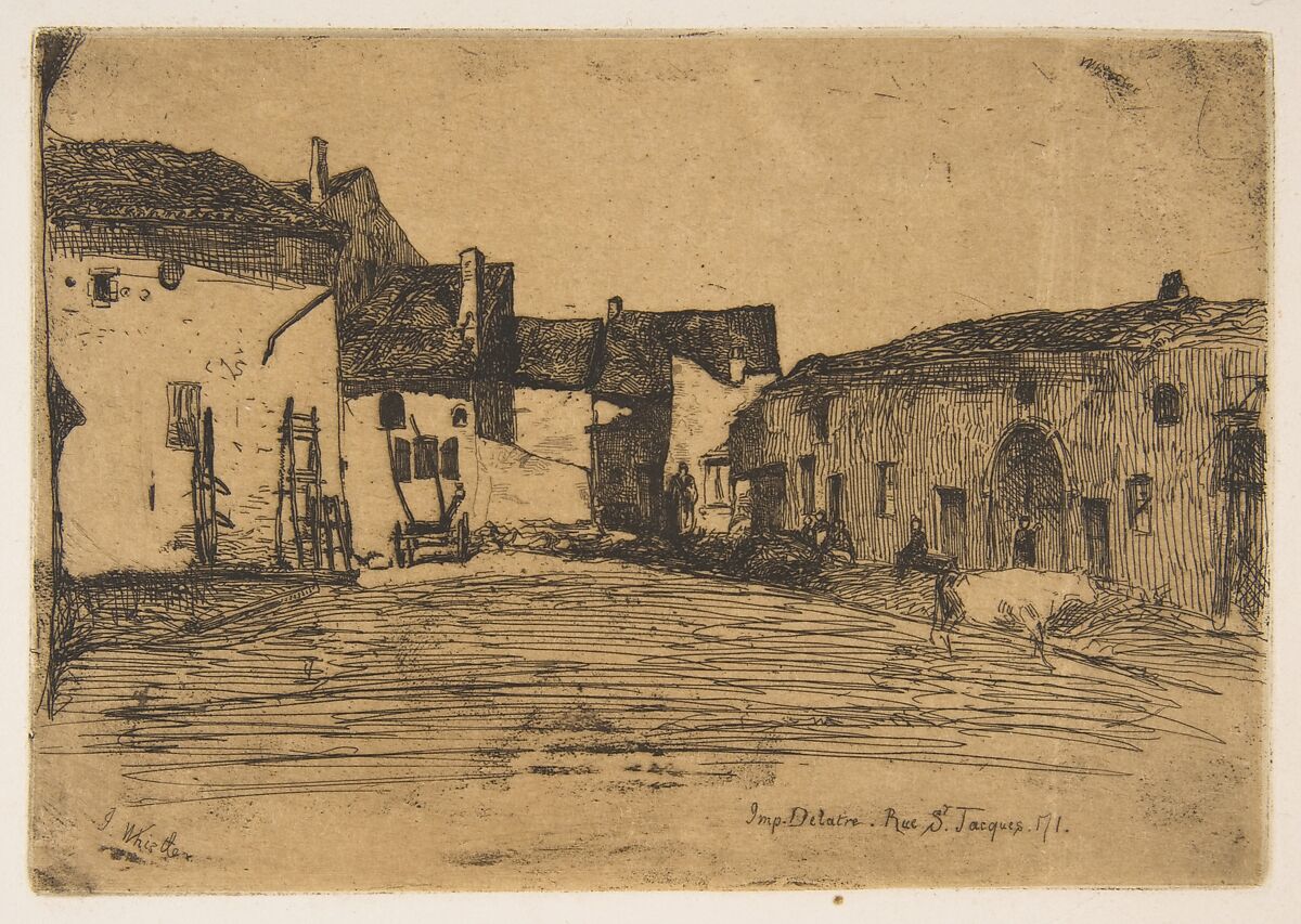 Whistler visited Liverdun, a town on the Moselle, near the start of a summer Rhineland tour in 1858. He traveled by train between Nancy and Strasbourg, making sketches and a few etchings, including the present work. Here, old farm buildings frame a yard and establish what would become a favorite formal arrangement. Roofs and walls are punctuated with shadowed openings to create a play of lights and darks enlivened with the lightly etched forms of farm workers, ladders and a cart. A white cow walks out of the space at right, and broad expanses below and above suggest ground and sky. This composition was one included in "Douze eau-fortes d'apres Nature" (known as the "French Set"), the artist's first published work, issued in November 1858.