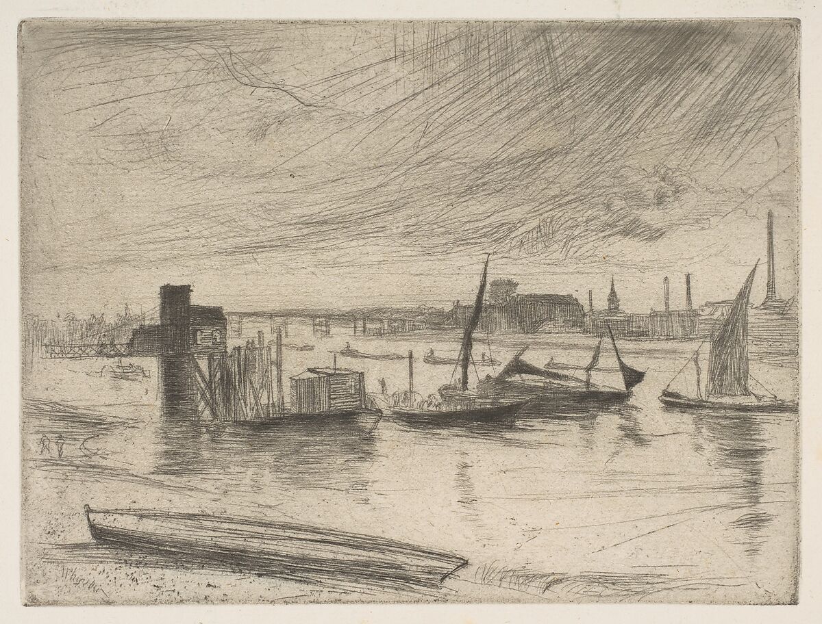 In a scene near his new lodgings on Lindsey Row in Chelsea, Whistler responds to the calm of the Thames at dawn. A beached rowboat lies across the foreground and small sailboats cluster around a wooden dock at center. Beyond is a wooden ferry terminal rests on Cadogan Pier and Battersea Bridge extends across the river. Drypoint has been combined with etching to create soft effects evocative of misty water under an overcast sky. The print probbaly was made in 1863, but not published until in 1871 in A Series of Sixteen Etchings of Scenes on the Thames and Other Subjects (the "Thames Set").