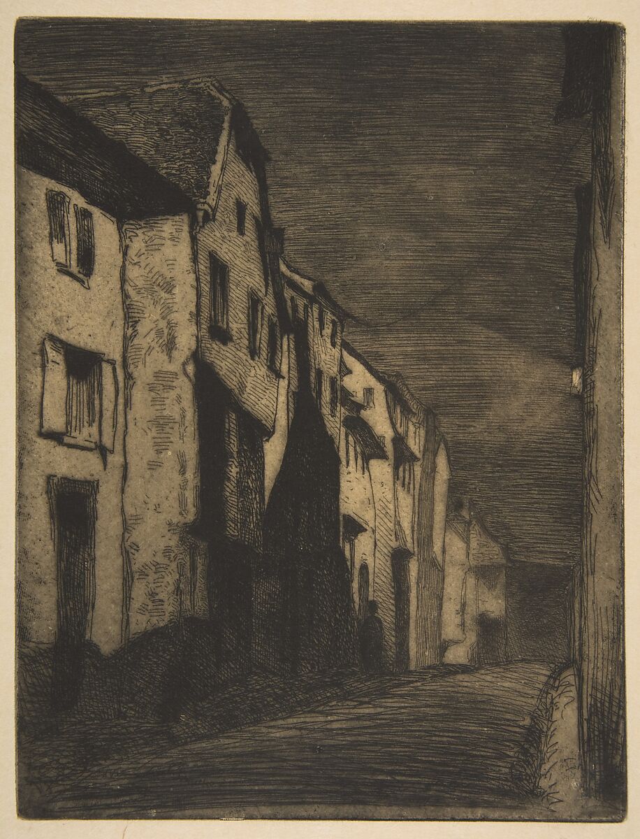 After visiting the Alsatian town of Saverne in the summer of 1858, Whistler produced his first etched "Nocturne." Sharp recession heightens the irregular forms of old buildings, with a gas lantern hanging at right casting deep shadows. Whistler included this work in his first published set, "Douze eaux-fortes d’après nature" (Twelve Etchings from Nature), which he always referred to as the "French Set." This is a later reissue with the printer's name removed.