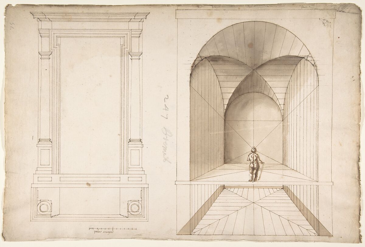 Unknown, portal or niche, plan and elevation; perspective study, interior, square chamber with cross-vault, with a scale figure (recto); blank (verso)