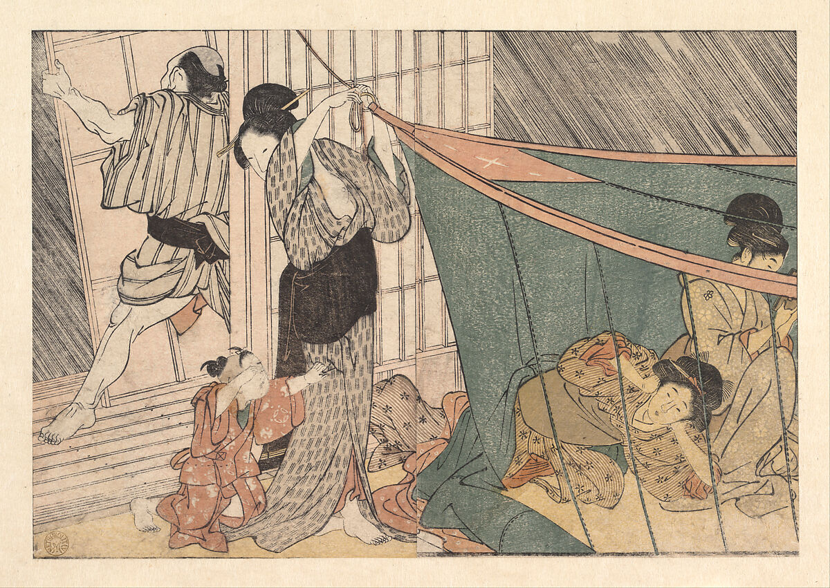 Utamaro portrays a moment in which life in a townsman's home is enlivened and refreshed by a sudden change in the weather. The father rushes to close the outer doors against the rain, while family members dive under a raised mosquito net, which was believed to offer protection from the thunder spirits.