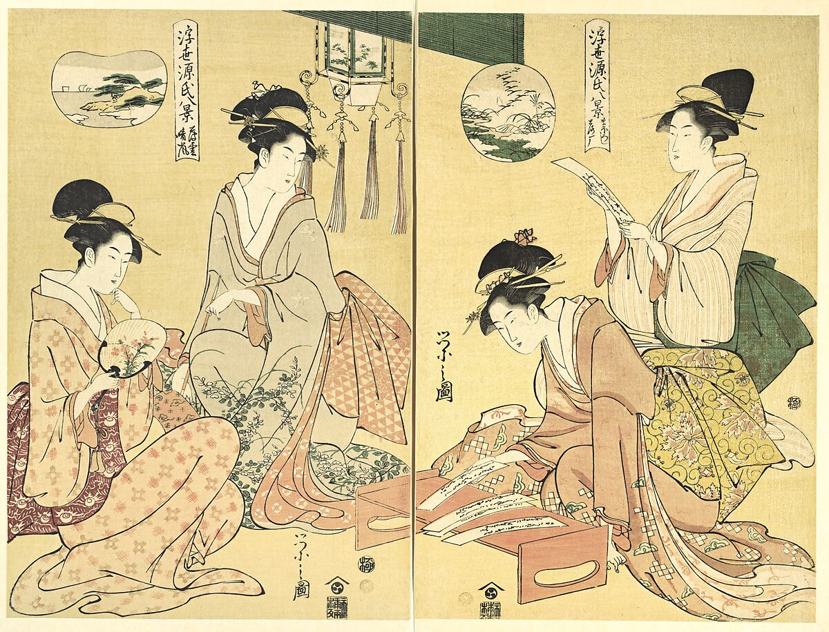 In addition to his parodic Genji in Fashionable Modern Guise prints, Eishi created eight prints in diptych format that allude to Genji episodes. Each displays two beauties, with landscapes in insets that reference the scenic “Eight Views of Ōmi” and correspond to chapters from the tale. In the print representing Chapter 41, “Spirit Summoner,” the encircled geese and autumn grasses evoke a poem by the Akashi Lady. On the left, Chapter 19, “A Thin Veil of Clouds,” is recalled by the landscape of Awazu, a name that refers either to Genji’s interest in Akikonomu, or to a poetic exchange between Genji and the Akashi Lady.