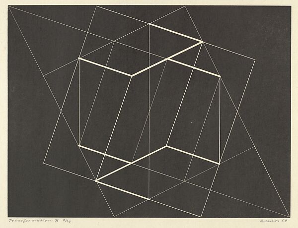 Produced the year that Albers became head of the department of design at the Yale University School of Art, the series of four Transformation prints emerged from the experimentation that characterized his earlier woodblock prints at Black Mountain College in North Carolina. By shifting to the mechanical rendering of geometrical forms (through machine engraving), Albers stripped away the materiality of his earlier work, achieving an almost preternatural purity of form. Influenced by the appeal to technology of the Bauhaus movement in Germany, Albers’s print displays floating wireframe shapes against a black background in an example of geometrical abstraction devoid of scale and exterior reference.