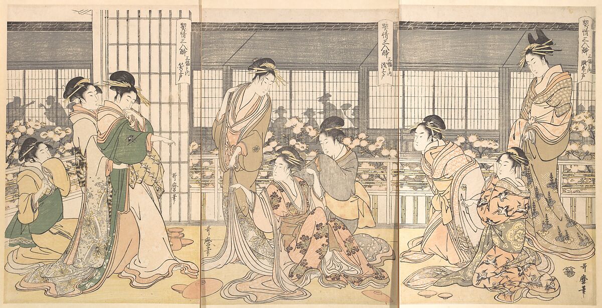 This dramatic triptych displays an unusually subdued color palette for Utamaro. So limited is his palette that the artist utilizes the color of the unprinted paper as part of the design on the courtesans' robes. The large oban format became popular at the end of the eighteenth century, replacing the smaller chuban format favored by such artists as Harunobu. Utamaro's use of silhouette to render the enormouse length of the Green House and its inhabitants is unquestionably bold. Three groups of courtesans stand on a balcony, and the tops of the blossoming cherry trees in the courtyard are visible behind them. The silhouettes visible across the courtyard reinforce the almost claustrophobic lack of privacy afforded by these pleasure houses. The print is a humorous morality tale of the dangers of alchohol. Utamaro's inscriptions describe the various reactions people have when intoxicated. The are, from left to right: laughter, crying, and anger. Teacups strewn on the ground and the women's unusually animated expressions are further testimony to the hazards of drink. Courtesans were expected to be the very model of civilized women displaying intelligence, refinement, and grace. The inconsonance of this scene with the ideal only adds to its wit and affirms Utamaro's imaginative approach.