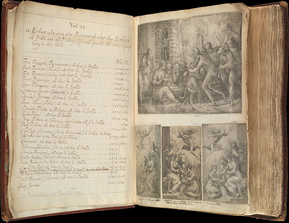There are 144 folios containing prints out of an original 167 folios, some of which have been removed. The folios numbered up to 144 in modern hand (pencil) take into account the pages removed. Mottled fly leaves at front and back. Recto of first unnumbered folio has pen and ink inscription ‘Vol 6th 25 prints taken out: 1772 / N 3 all double’. Verso of first unnumbered folio inscribed ‘Vol: VI / 23 Etchers who were also Painters all that they Etched, & ‘/ at ye end are all yt Aug: Caracci graved, the other 2 Carats’s / being in this book’, followed by list of artists with their birth and death dates.