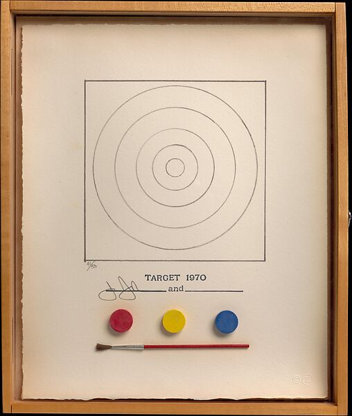This work presents the outlines of five concentric circles accompanied by three dried watercolor cakes in the primary colors and a small red paintbrush. Johns wryly makes reference to the ubiquity and banality of targets, as well as to the seeming simplicity of his own celebrated creations. Below the work's stamped title and date is the artist’s signature followed by the word "AND" with a blank line, anticipating the addition of another name, that of Johns’s eventual collaborator. Target thus generates a paradox: the work can only be "completed" by someone else, but to do so would perhaps also destroy the integrity of the artwork. Therefore the work must remain in a perpetually unfinished state.