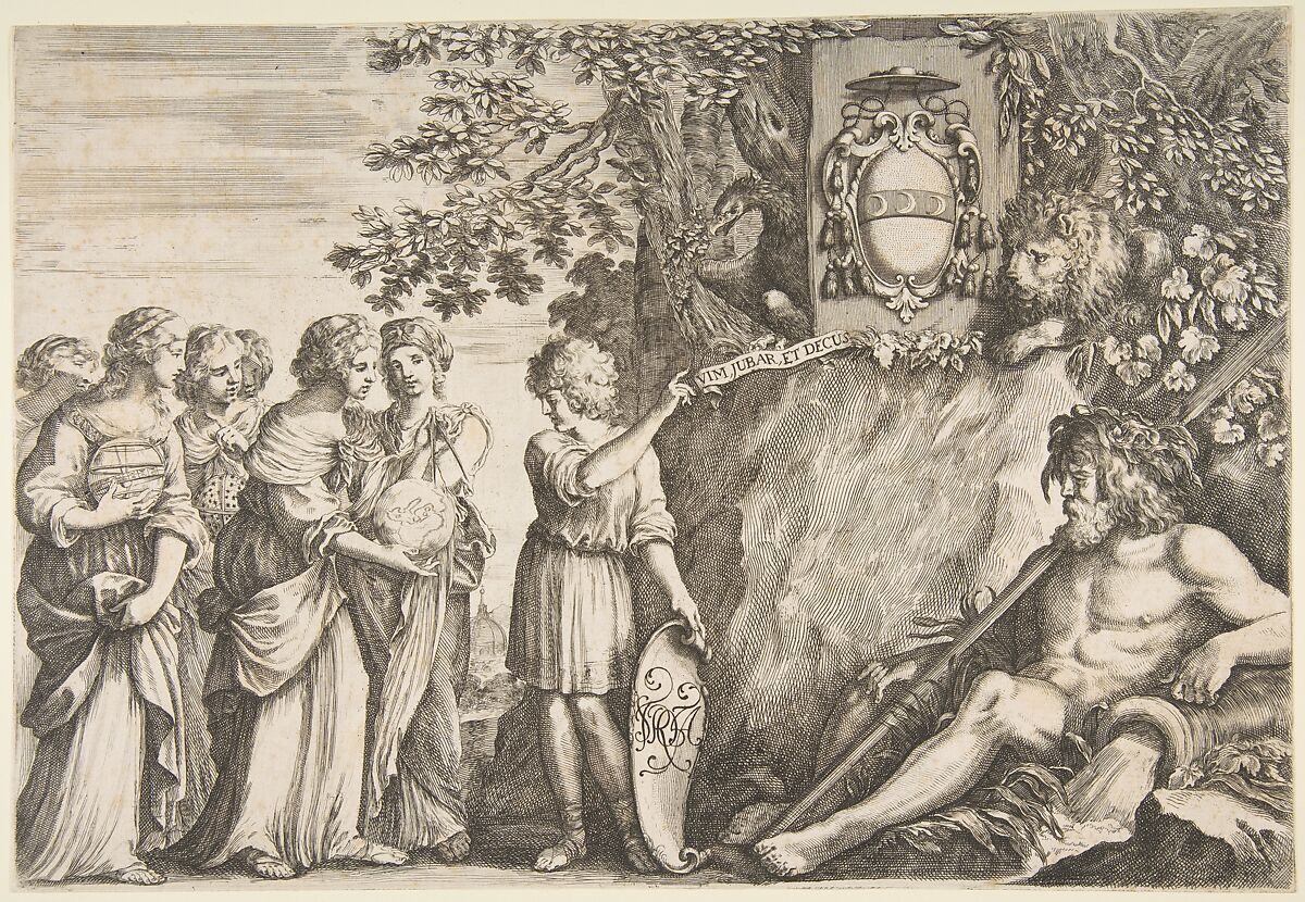 A young man leads a group of maidens toward the Strozzi coat of arms, held upon a rocky outcrop between a lion and an eagle. This youth gestures to a Latin banderole translated as "force, glory, and honor," proclaiming the rewards the noble family received as the dedicatee of the print. The figures hold a terrestrial globe, a celestial globe, a compass, and an armillary sphere, representing humanity’s attempts to chart the earth and the cosmos. An allegorical river god reclines in the right corner, evoking the bodies of water that were navigated using such knowledge. This kind of a print, which addresses the general pursuit of knowledge, would have been suitable for thesis defenses in various subjects.