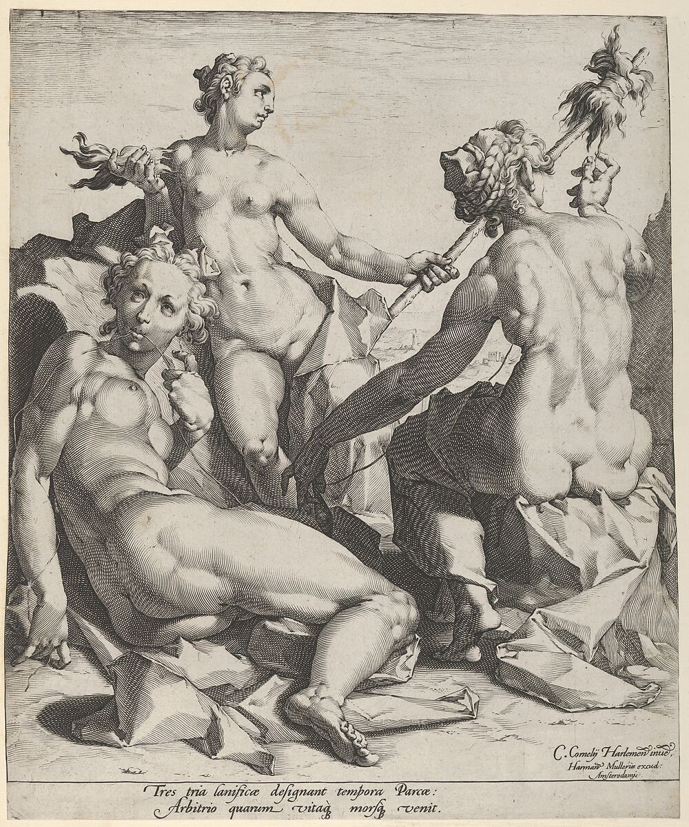 Muller made six engravings after Cornelis; and, impressions of four are in the Met. In addition to the present work they include Cain Killing Abel (56.597.4), Arion on a Dolphin (56.597.5) and The Fight Between Ulysses and Irus (56.597.6). According to Greek and Roman mythology, the Three Fates were goddesses who determined the course of human lives and were traditionally portrayed as women spinning wool. Muller shows them seated together in a rocky landscape, overlooking a barren plain with a few buildings in the far distance. In the center is Clotho (Greek for ‘the spinner’), spinning the thread of life for all mortals; at the right is Lachesis (‘the apportioner’), measuring out the thread -- determining the length of a mortal’s life; and at the left, Atropos (‘she who cannot be turned’), cutting the thread, signaling the moment of death.