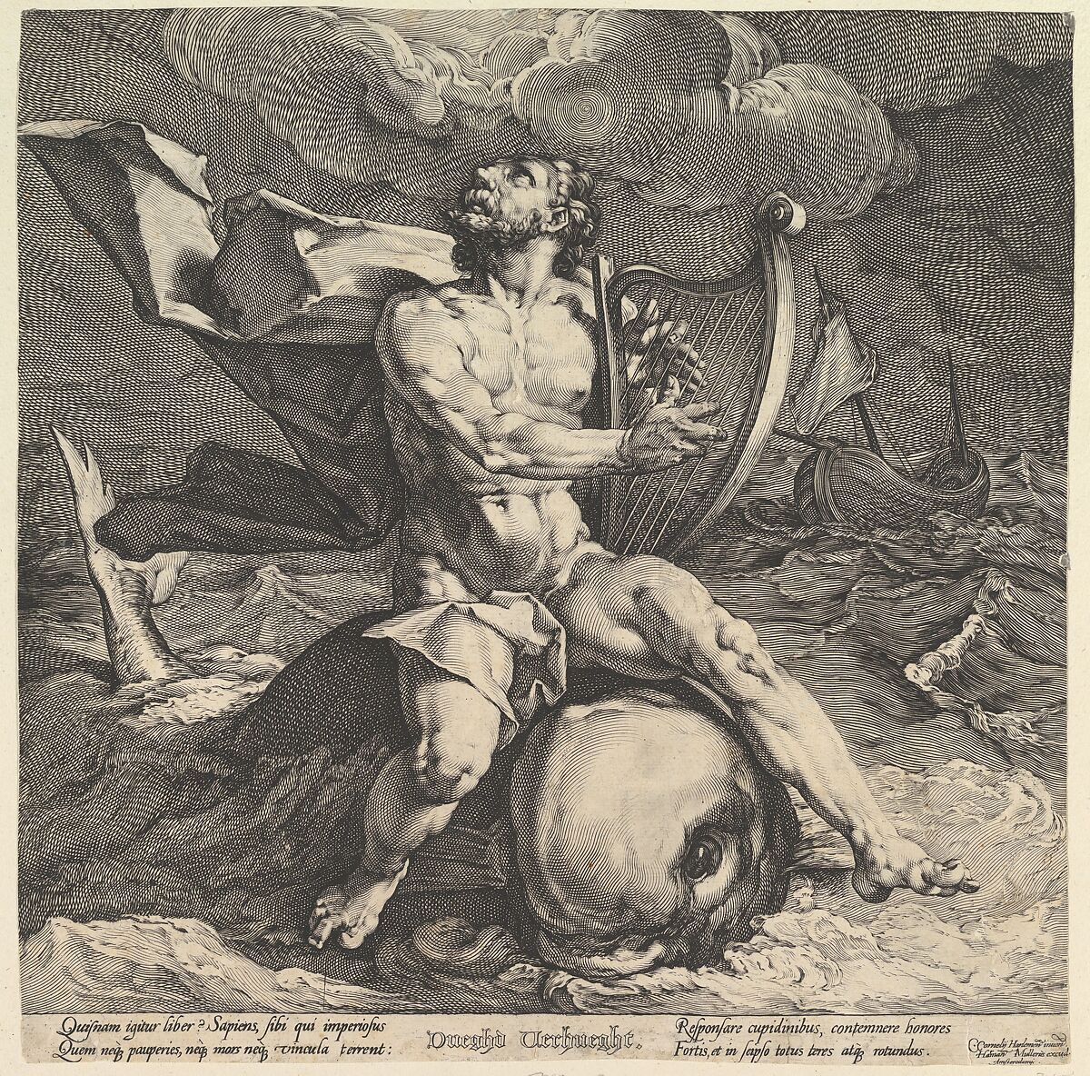 Muller made six engravings after Cornelis; and, impressions of four are in the Met. In addition to the present work they include Cain Killing Abel (56.597.4), The Fight Between Ulysses and Irus (56.597.6) and The Three Fates Clotho, Lachesis and Atropos (56.597.7). This work illustrates a scene from the life of Arion, aGreek poet and singer, who lived in Corinth in the sixth century BC and was considered the best lyre player of his time. Returning from a sojourn in Italy and Sicily, Arion was seized by sailors who robbed him of the fortune he had made in various musical contests. They allowed him to sing one last song before hurling himself into the sea. His beautiful music, however, attracted a school of dolphins who rescued him. They were likely sent by Apollo, the god of music and poetry. In the present work, Arion is sitting astride a dolphin strumming his lyre, despite the menacing clouds and turbulent sea, on his way back to home to Corinth.