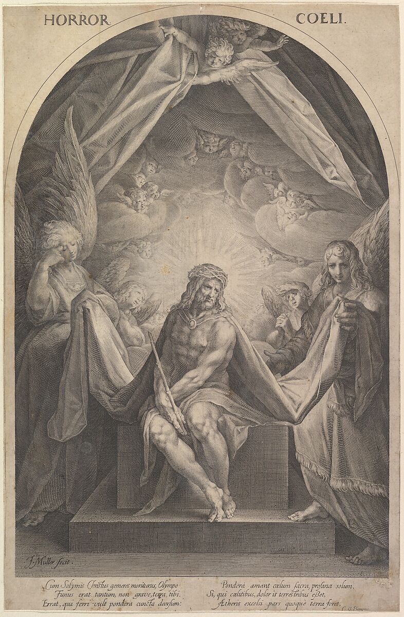 In this somber engraving, Christ is seated on a block of stone, surrounded by angels. He wears a long, tasseled robe, holds a small branch in his hands as if it were a scepter and has thorny branches circling his head as if they were a crown. The narrative of Christ wearing a crown of thorns is recounted in the Gospels of Matthew, Mark and John and when he is tortured and mocked by his jailers just prior to the Crucifixion. Jan Muller was one of the most sought-after Mannerist printmakers, engraving the compositions of the leading artists of the late sixteenth- and early seventeenth- centuries. Here in a relatively rare composition after his own designs, he removes the event from the story of the Passion and sets it in heaven, turning the image into an object of veneration and devotion. He places it within an arched frame, similar to that in The Baptism of Christ (51.501.6338) and The Virgin with the Child Blessing (2014.662), though less elaborate, so that the print functions almost like a small altar.