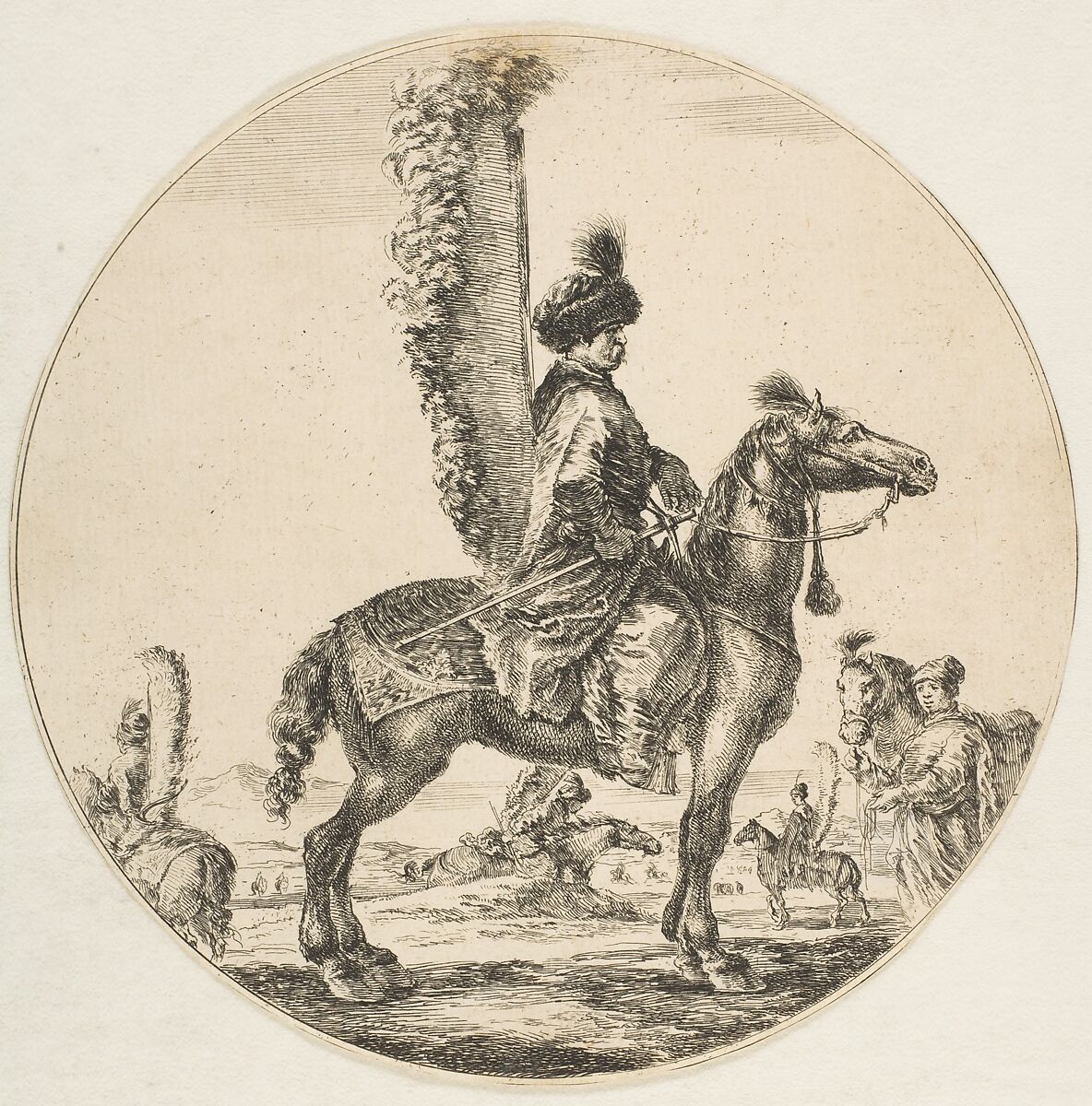 - Title: Polish hussar in profile facing right with wings attached to his back, a circular composition, from "Figures on Horseback" (Cavaliers nègres, polonais et hongrois)