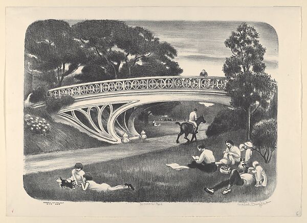 In 1935, when she was sixty years old, Dwight joined the Federal Art Project, an initiative under President Franklin Roosevelt’s New Deal that employed out-of-work artists during the Great Depression. She created In Central Park and several other lithographs under the auspices of the Graphic Arts Division of the Federal Art Project in New York. Because she suffered from chronic asthma, project administrators delivered heavy lithographic limestones to her fourth-floor walk-up in the Chelsea neighborhood of Manhattan so that she could work from home. She created a number of prints after sketches made on her explorations of New York, including this scene of people lounging beside the Gothic Bridge, which traverses Central Park’s bridle path.