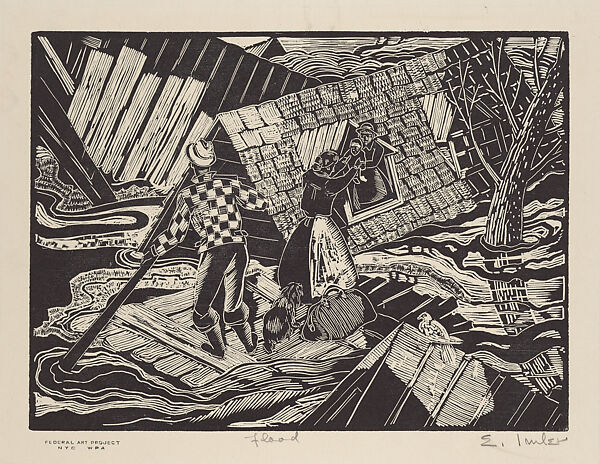 Born and raised in St. Clairsville, Pennsylvania, Imler might have referenced the 1936 flooding of Johnstown in his home state through this wood engraving. Following heavy rain and melting snow in March that year, a deluge devastated the whole town and left hundreds of residents homeless. In this print, the artist depicted one family rushing out of a flooded house, focusing on their effort to escape the water as it engulfs their property. Through a window, a woman hands a little child to another woman, who precariously floats on a piece of driftwood along with the rest of the family.
