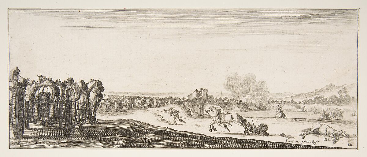 A procession of horse-drawn cannon carriages to left, horsemen in combat and a dead horse to right, battle on a bridge in center background, from "Peace and War" (Divers desseins tant pour la paix que pour la guerre)