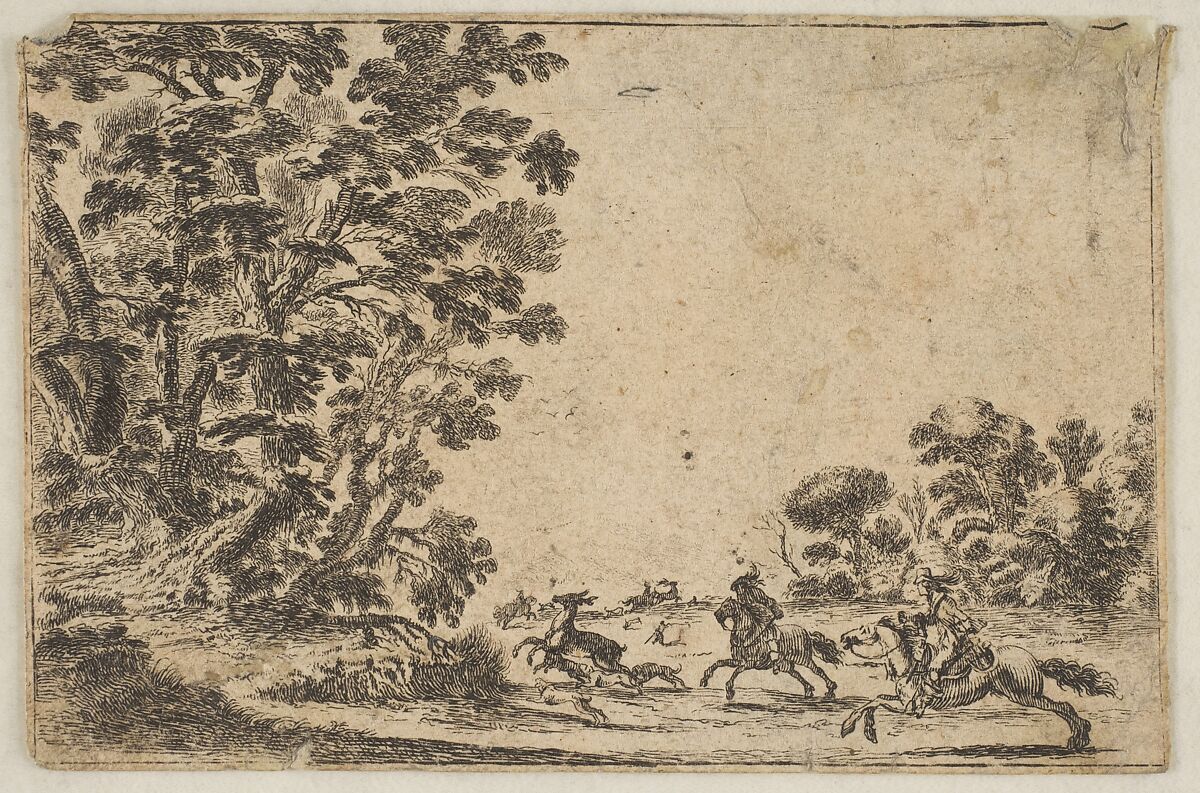 - Title: Plate 4: a deer hunt, two horsemen galloping towards the rightbehind three dogs and a deer, a group of trees to left, from "Various Figures" (Agréable diversité de figures)