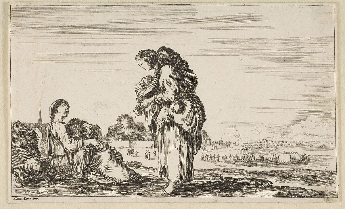 A woman seated to left holding a child, facing right in profile, conversing with a standing woman in center, carrying one child on her back and another in her arms, a church to left in background and boats to right in background, from 'Various figures and lands' (Diverse figure e paesi)
