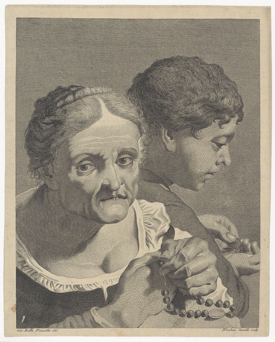 - Title: Copy in reverse of an old woman with a rosary and a boy counting coins; plate 10 from 'Icones ad vivum expressae' after Giovanni Battista Piazzetta