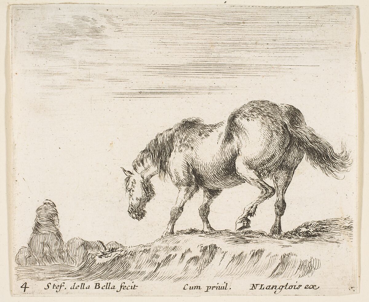 - Title:A horse in profile facing the left, about to descend from a mound, a horseman to left in background, plate 4 from "Diversi capricci"