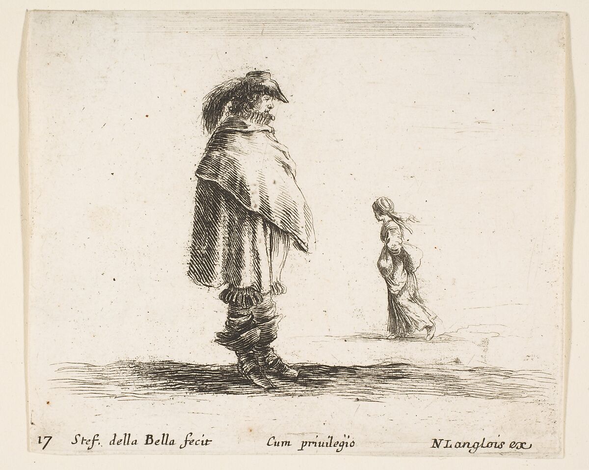 - Title: A man wearing a plumed hat in center facing right, a woman walking towards the left in the background, plate 17 from "Diversi capricci"