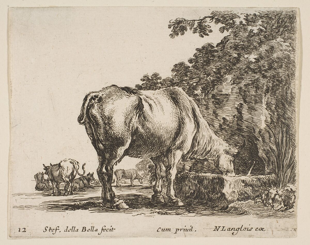 - Title: A cow drinking from a stone trough, other cows to left in background, plate 12 from "Diversi capricci"