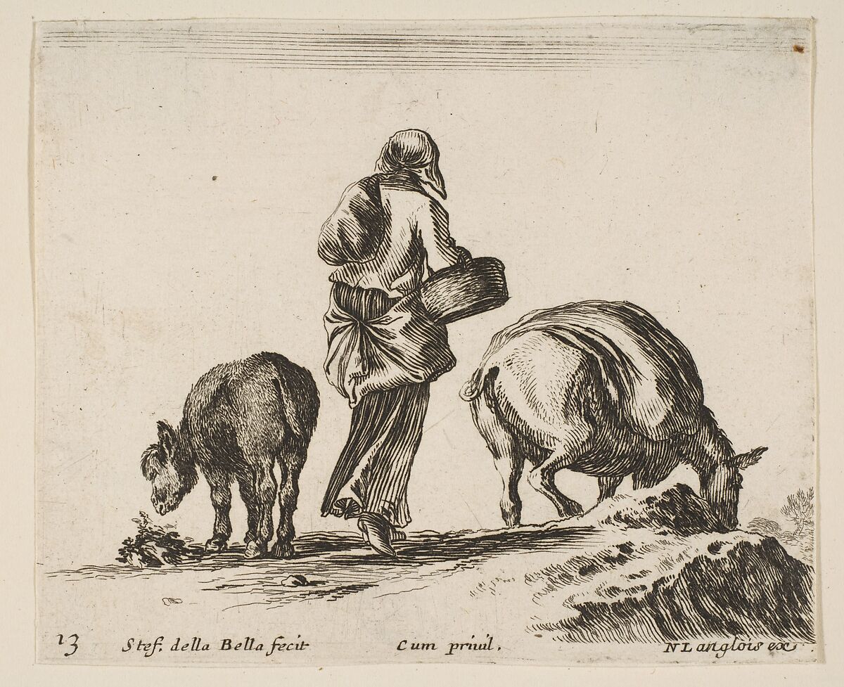 - Title: A peasant woman, seen from the back, holding a basket in center, a donkey to left and a horse with a pack on its back to right, plate 13 from "Diversi capricci"