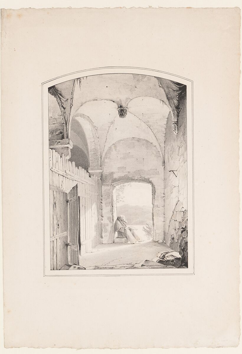A pilgrim looks up from his book to gaze into the distance as brilliant sunshine streams into the shadowed structure where he rests. This tranquil scene is the most delicate and subtle of Karl Blechen's prints, an early work by the painter and draftsman whose prolific career lasted only a brief fifteen years. Blechen created some fifty etchings and lithographs during his lifetime, and these are among his rarest works. He produced this lithograph for a portfolio published in 1827 by the artists' group the Berlinischer Künstlerverein. That year, he left a job as a designer of stage sets at the Königstadt Theater in Berlin to embark on a career as an independent artist. Given his experience, the prominence he gave here to the evocative setting seems hardly surprising.