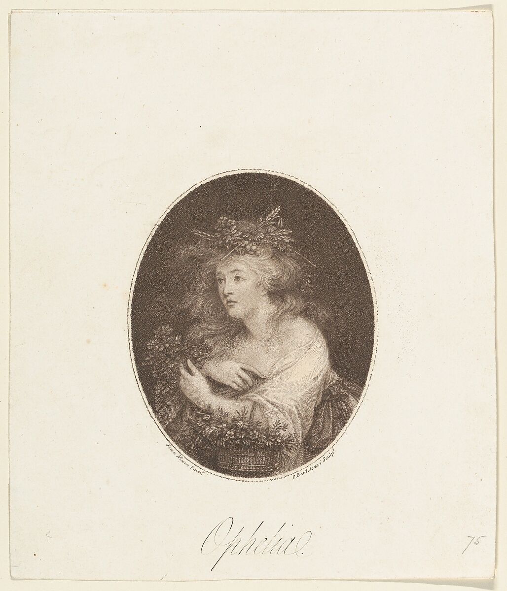 Bartolozzi's engraving, based on a drawing by Nixon, combines elements from both episodes to characterize Ophelia's tragic end.